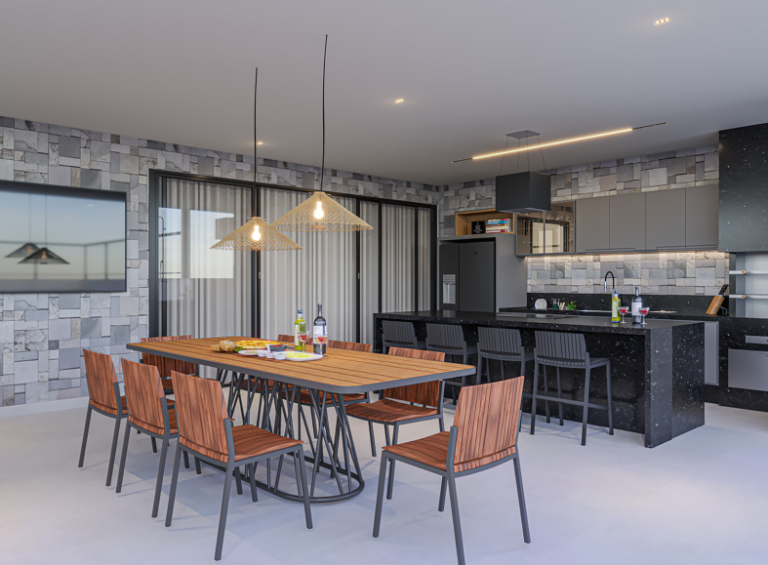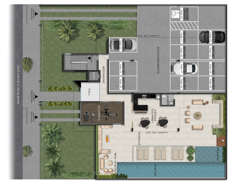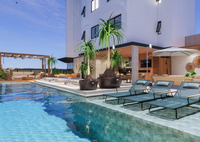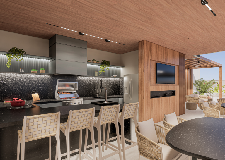 - Lazer exclusivo com espaço gourmet, espaço fitness, ampla piscina com raia e prainha, espaço fogo de chão e espaço Zen (pergolados).