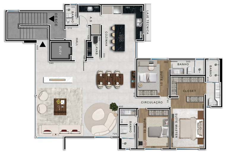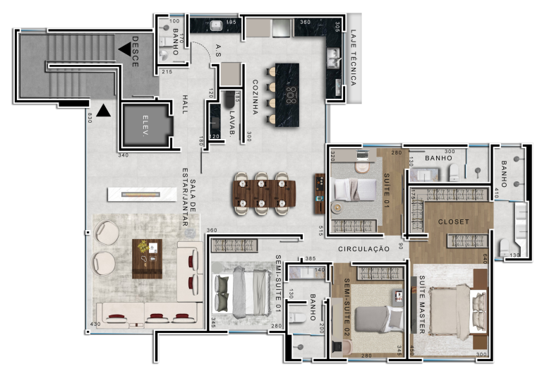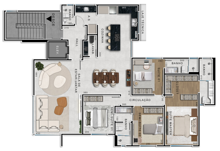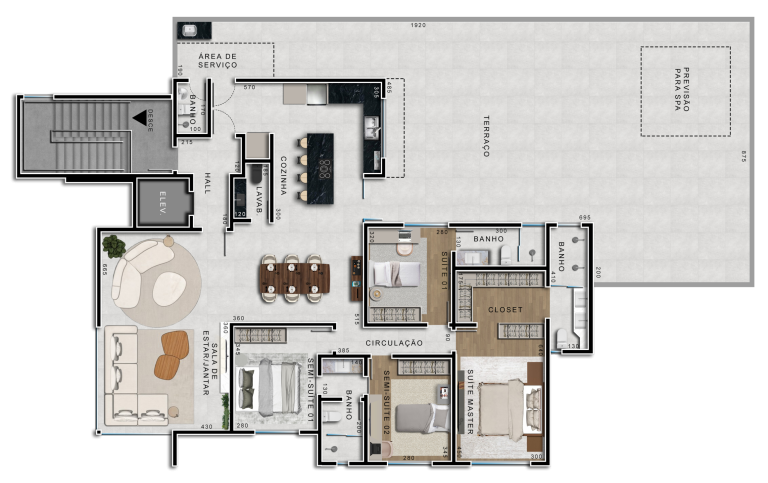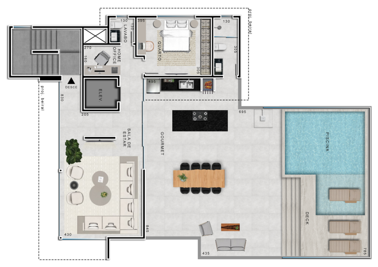 - Retirada da parede entre a sala e semi-suíte (opção home).